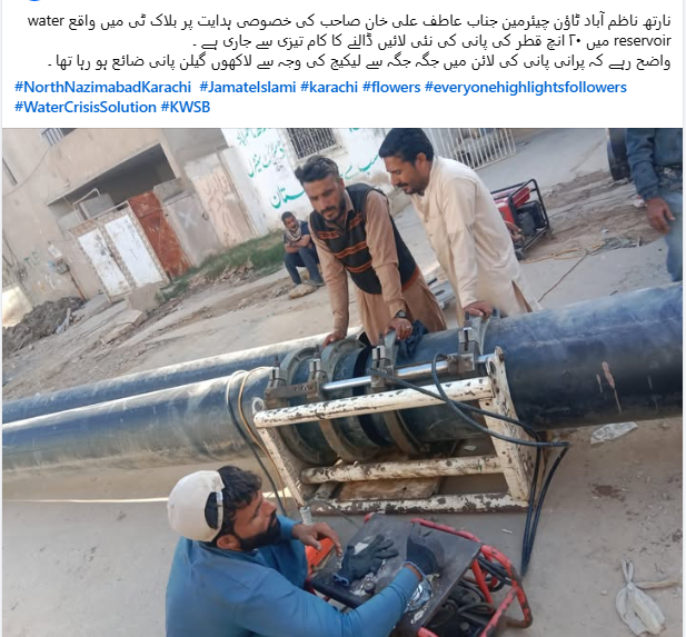 Connection of 8-inch water line in Block K at Mumtaz Hospital Lane