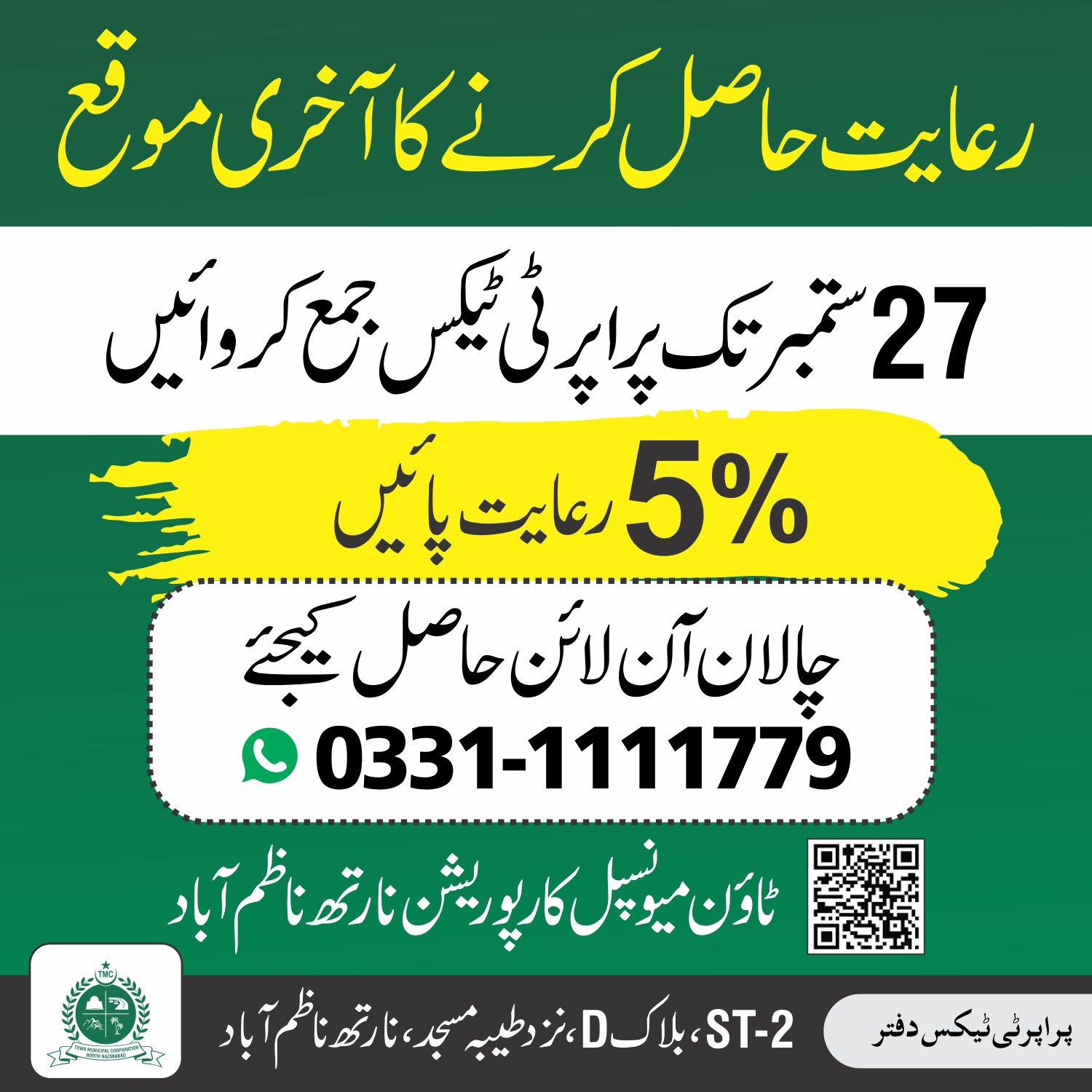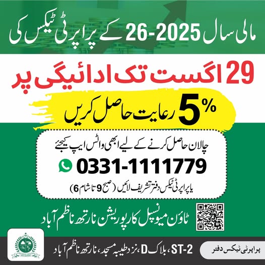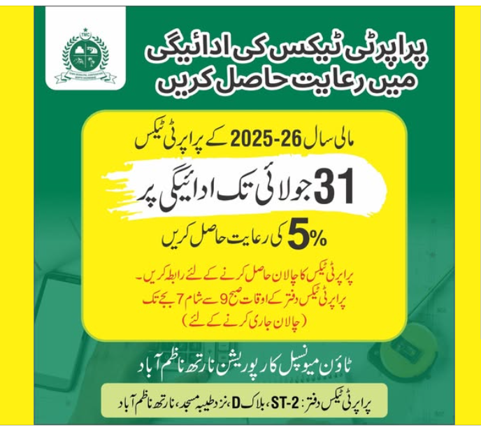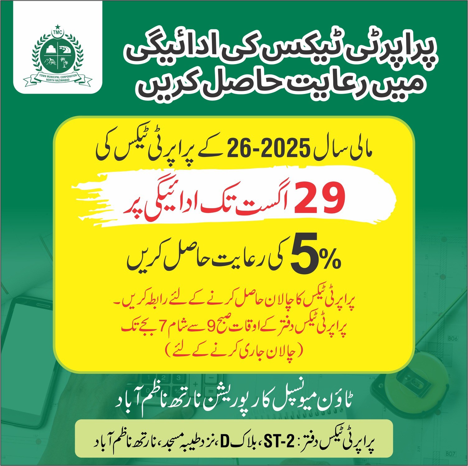 Avail a special 5% discount on property tax for the fiscal year 2025–26 by making the payment by July 31, 2025. Office Address: ST-2, Block D, near Tayyaba Mosque, North Nazimabad.