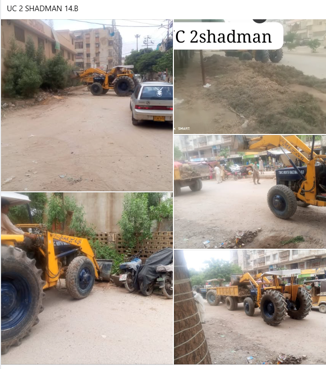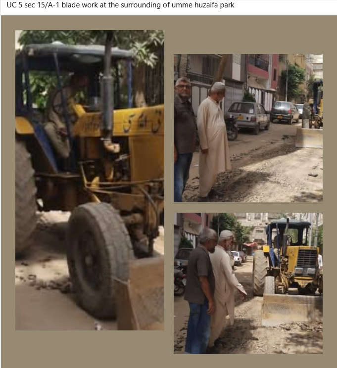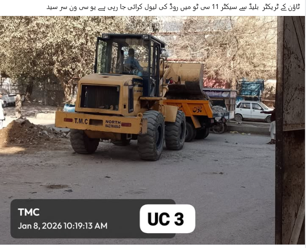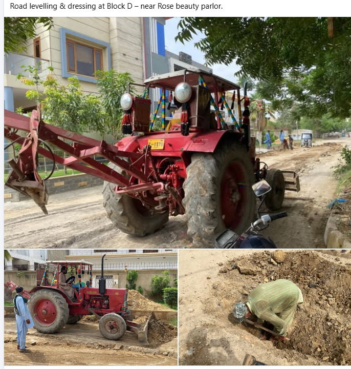 Road leveling is being carried out in Sector 11-C-2, UC-1 Sir Syed, using the town’s tractor blade.