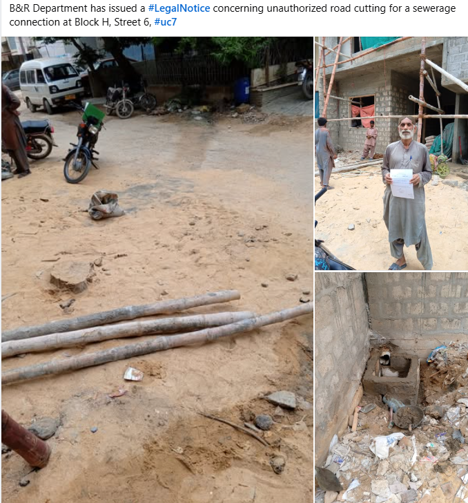 B&R Department has issued a #LegalNotice concerning unauthorized road cutting for a sewerage connection at Block H, Street 6, #uc7