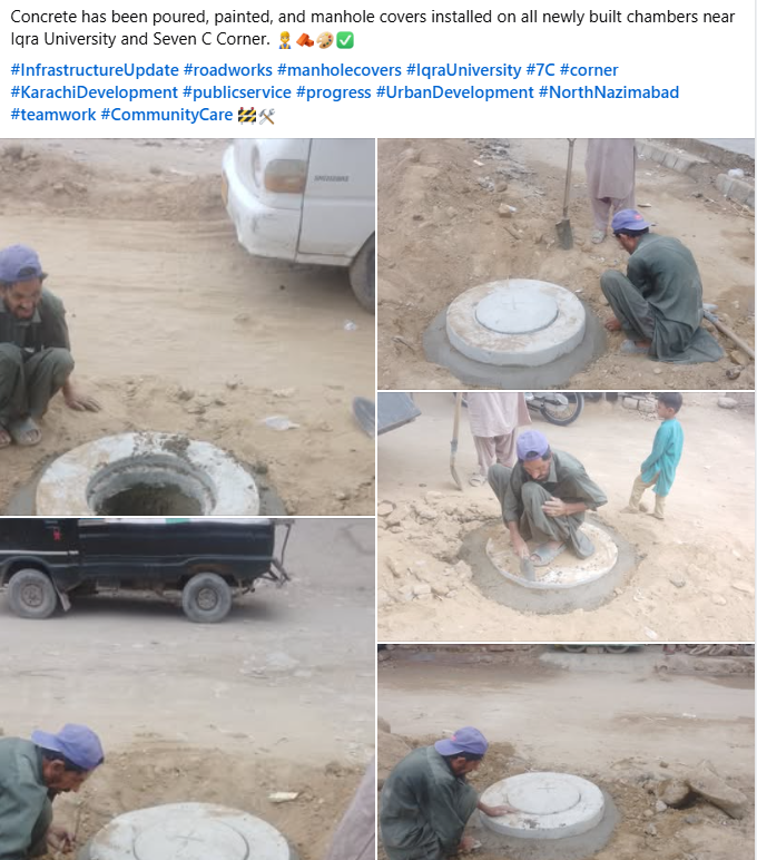 Concrete has been poured, painted, and manhole covers installed on all newly built chambers near Iqra University and Seven C Corner. 👷♂️🧱🎨✅