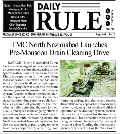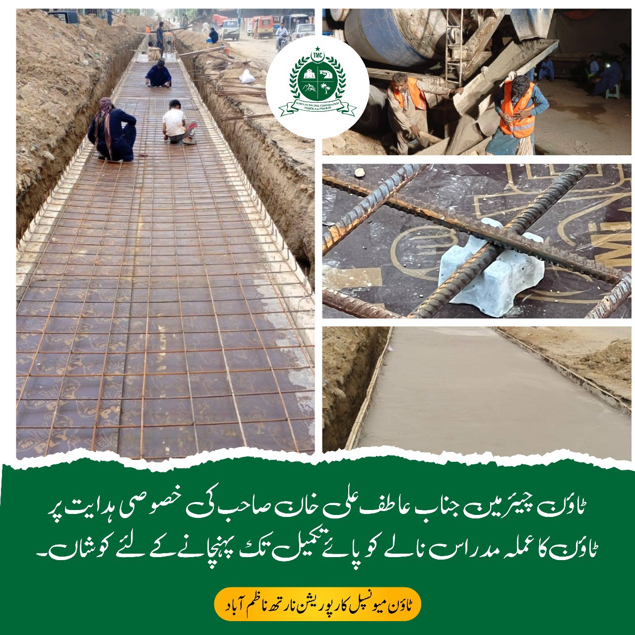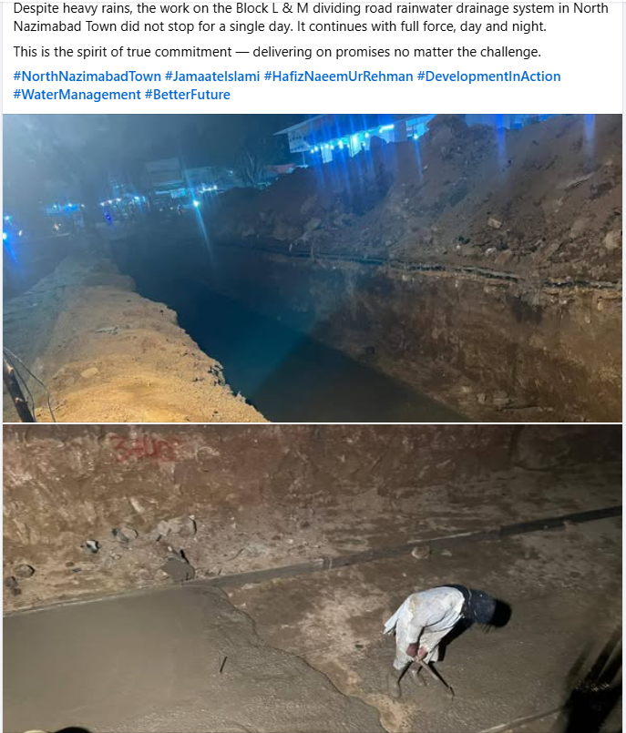 Despite heavy rains, drainage work on the Block L & M dividing road in N.Nazimabad Town continues day and night without interruption.
