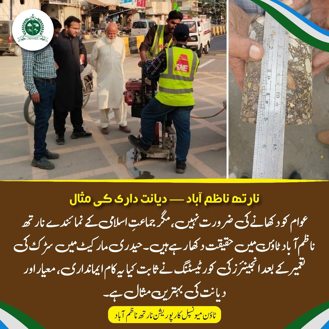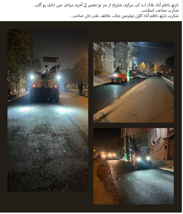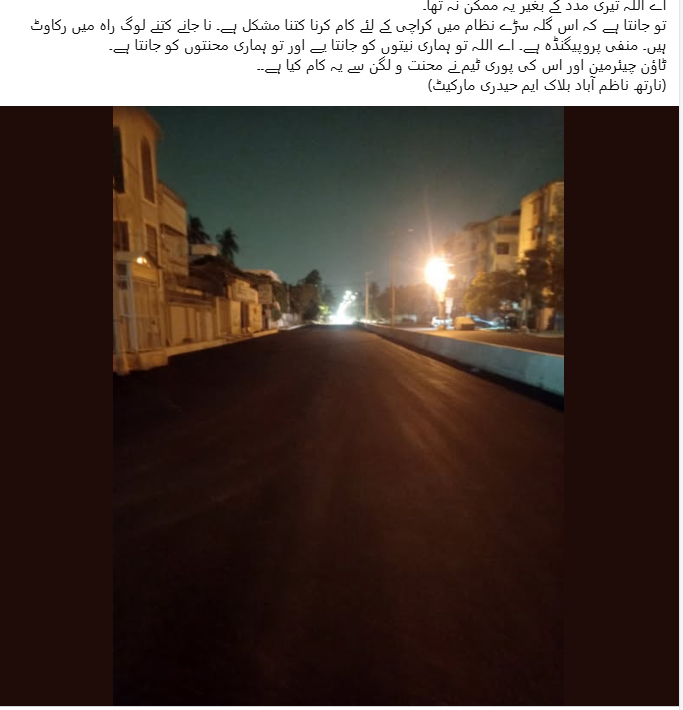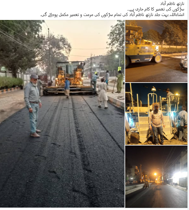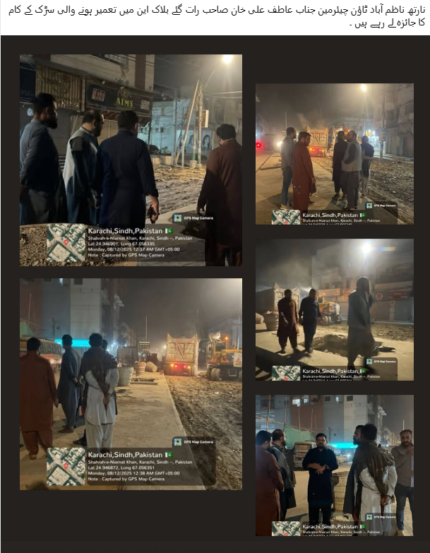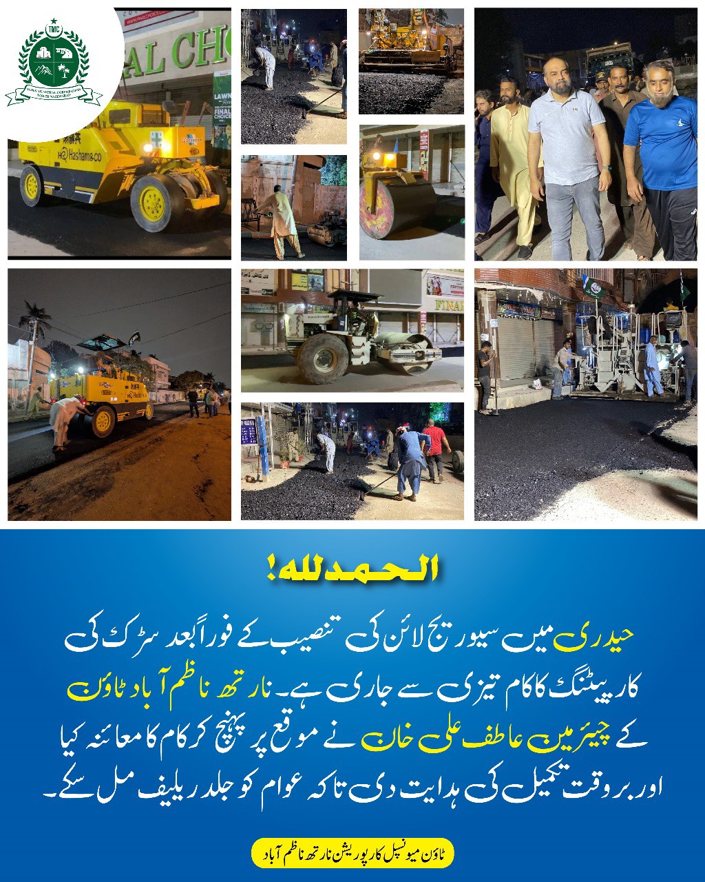 North Nazimabad Town Chairman, Mr. Atif Ali Khan, is inspecting the ongoing road construction work in Block N late at night