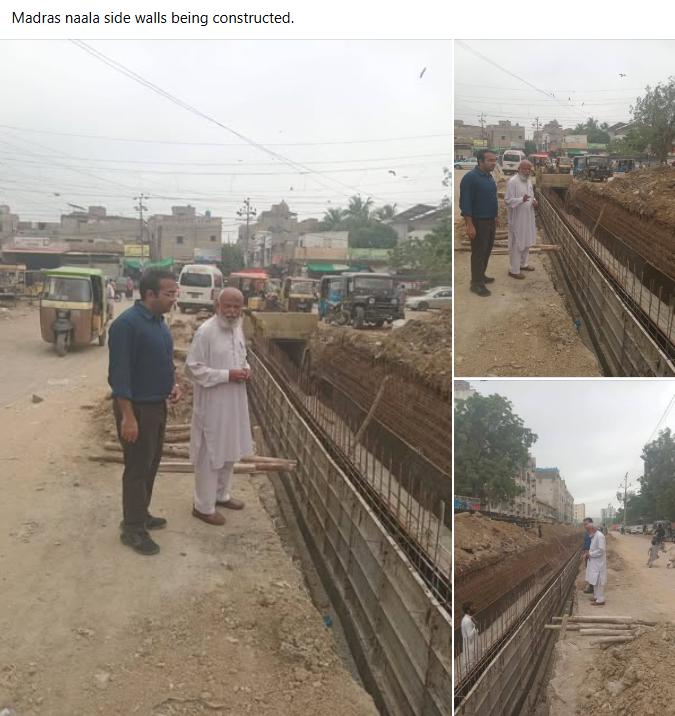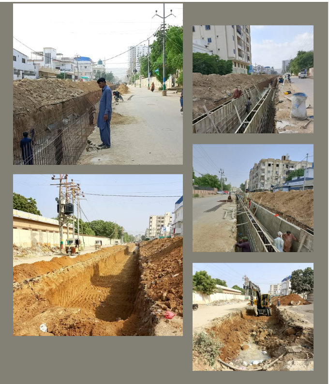 Construction of a one-kilometer-long stormwater drain from Mateen Foods to Karachi Dental College has begun