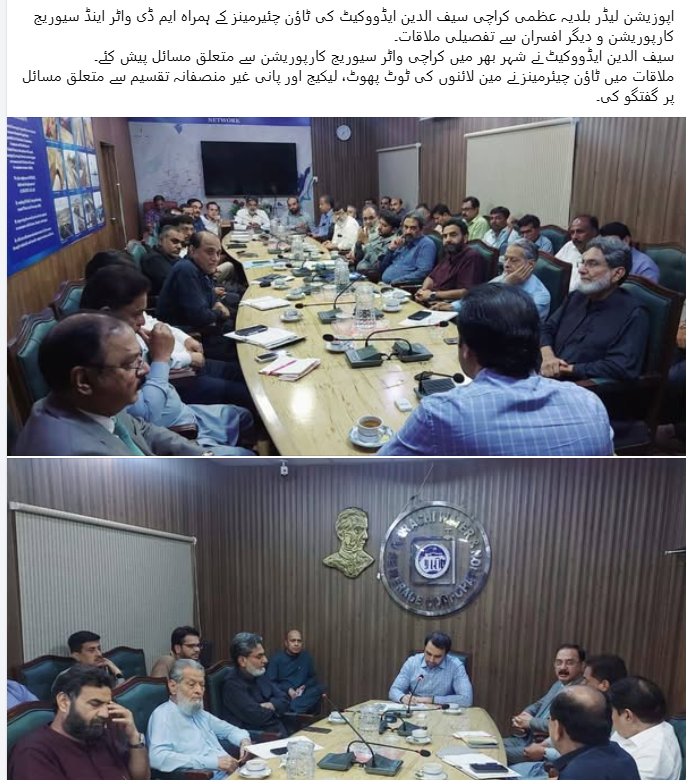 Opposition Leader Saifuddin Advocate and Town Chairmen met the MD of Karachi Water & Sewerage Corporation to address issues of line breakages, leakages, and unfair water distribution.