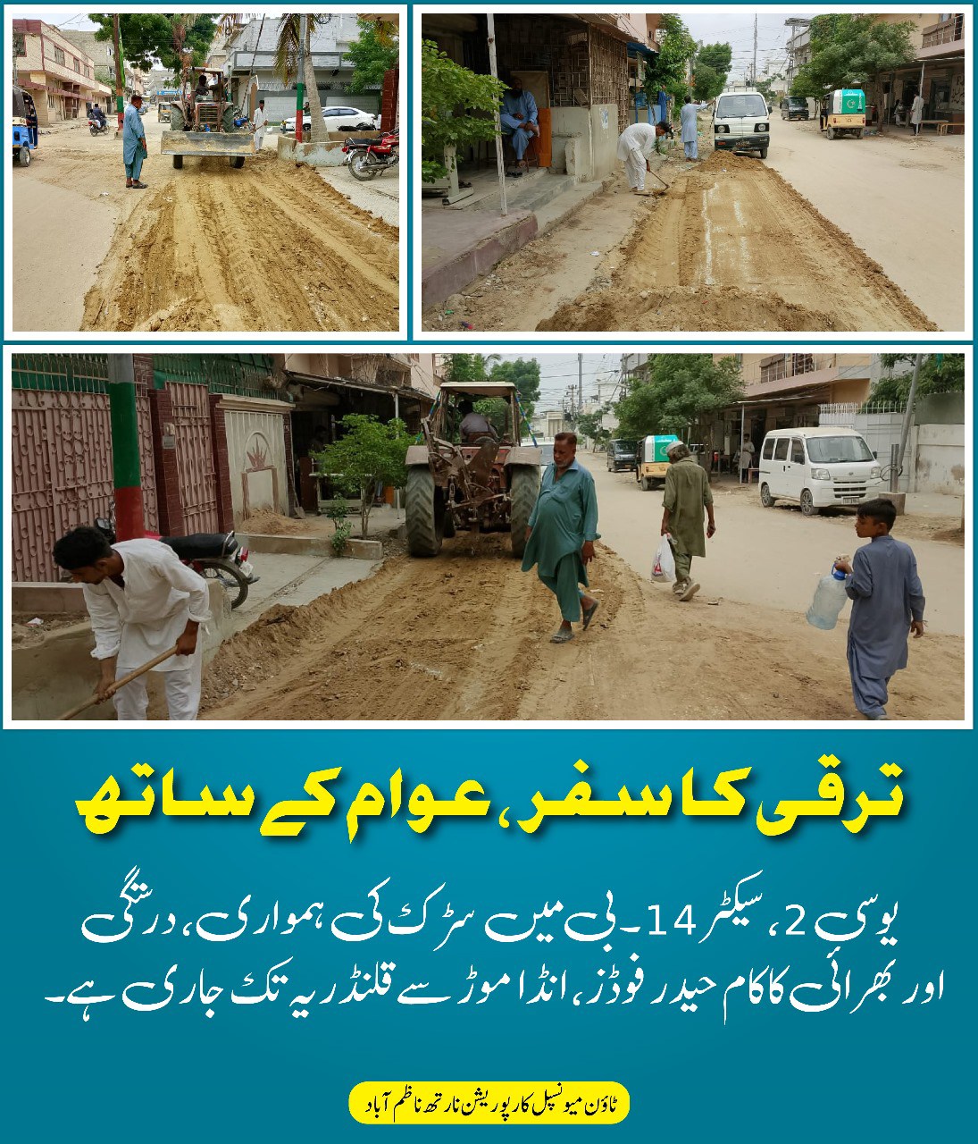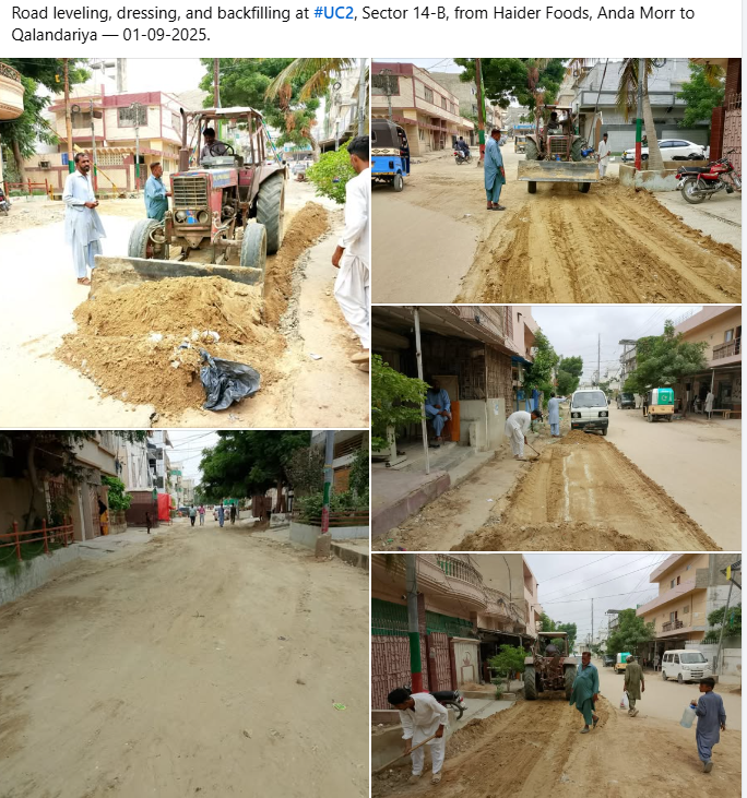 Road leveling, dressing, and backfilling at #UC2, Sector 14-B, from Haider Foods, Anda Morr to Qalandariya — 01-09-2025.