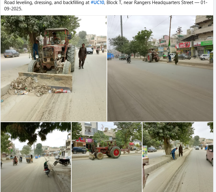 Road leveling, dressing, and backfilling at #UC10, Block T, near Rangers Headquarters Street — 01-09-2025.