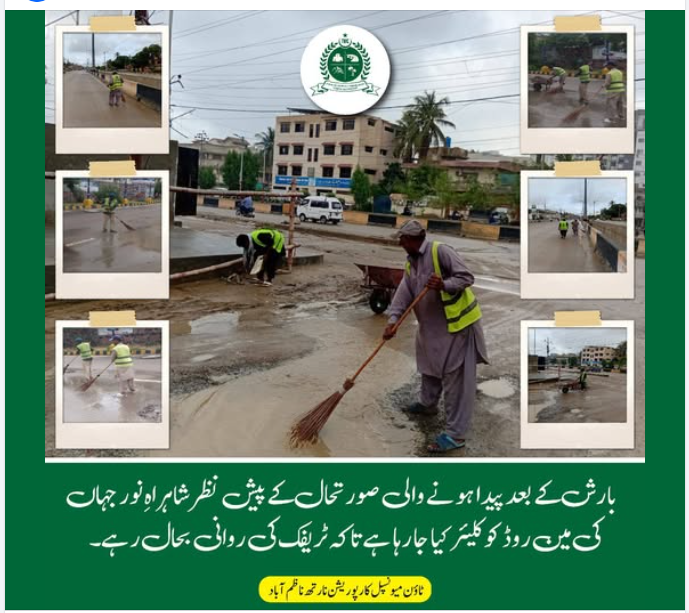 Water from the roads is being cleared after the rain at Shahrah-e-Noor Jahan